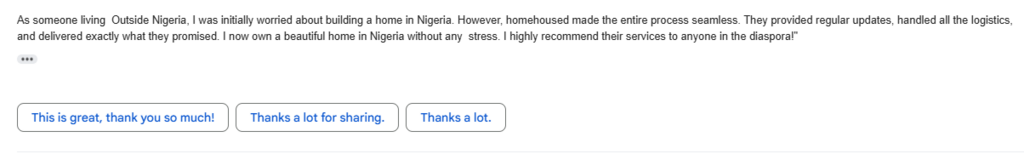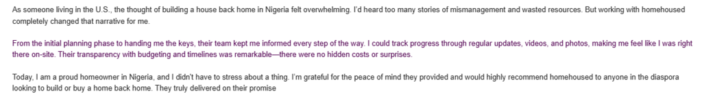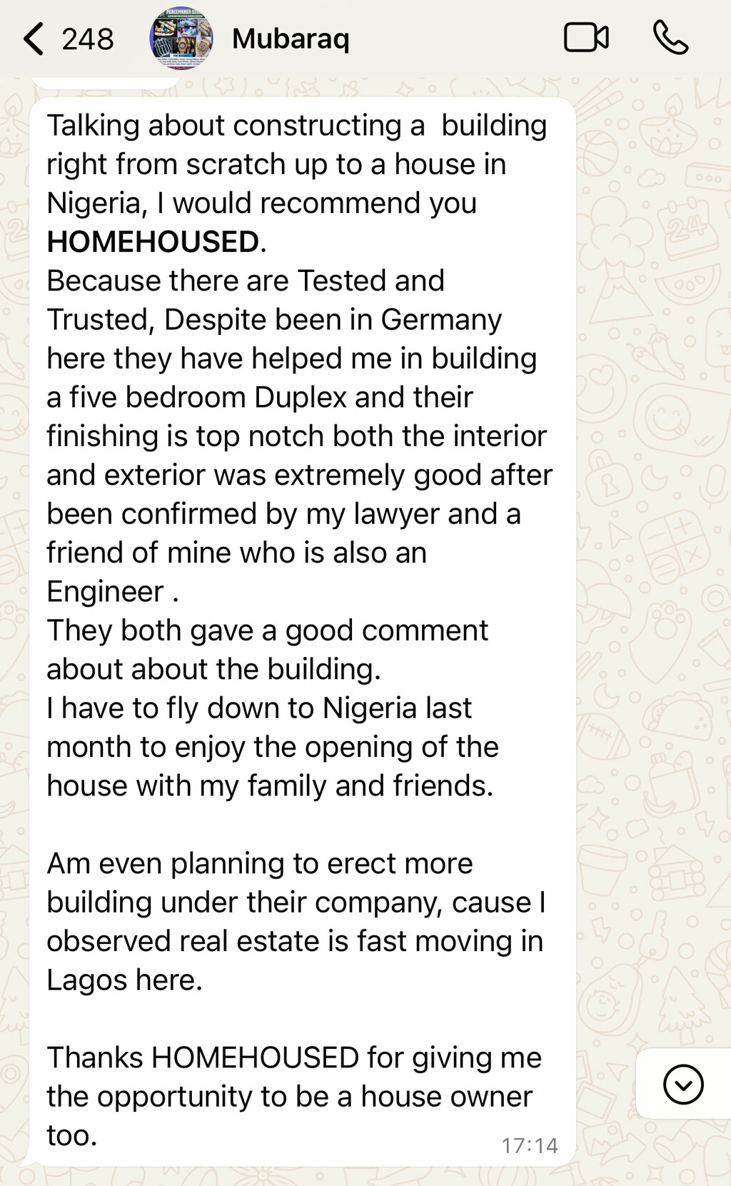 We are primarily using our wealth of knowledge and expertise to focus on acquiring and building properties ONLY for Nigerians in diaspora who are willing to have their home-owned structures in their home country.